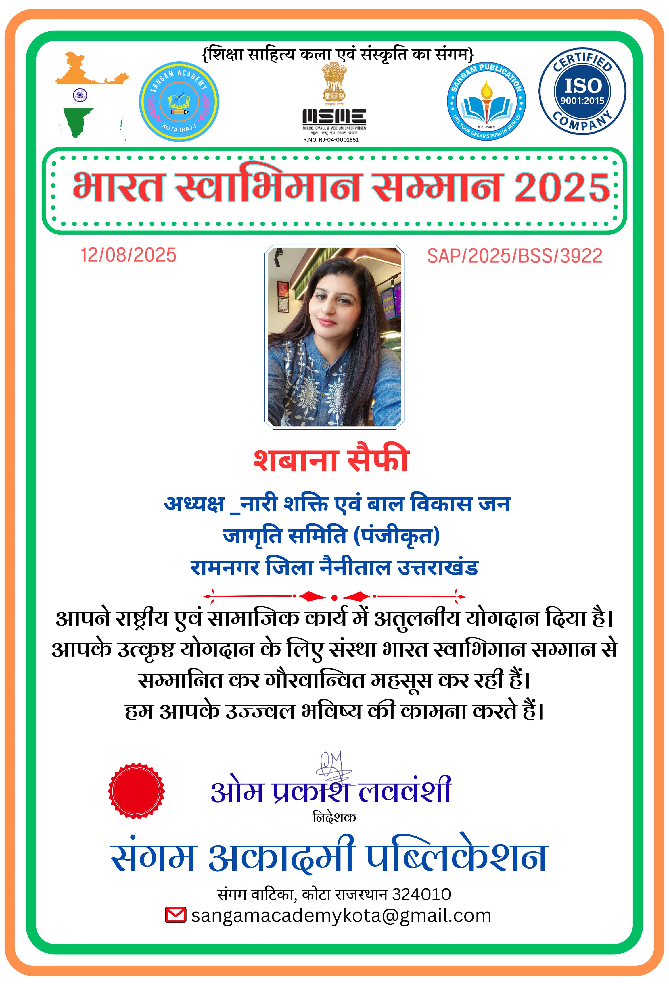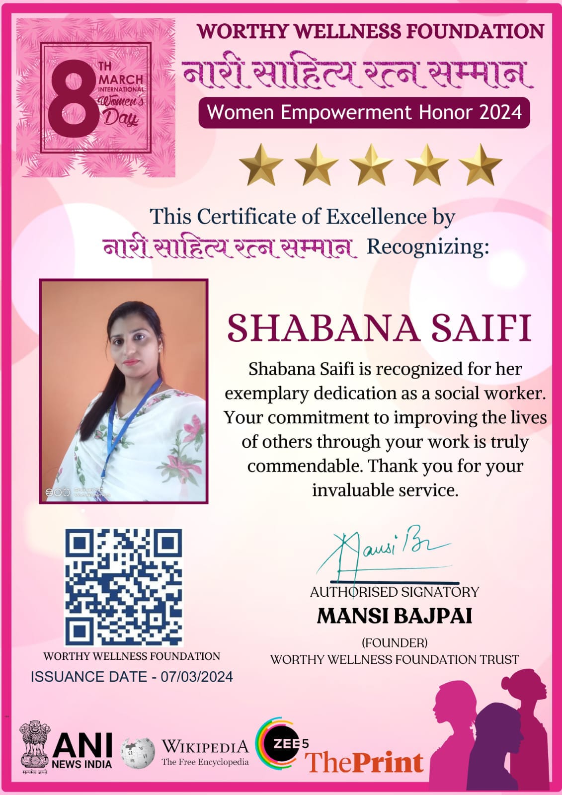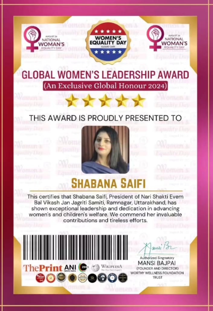 Mrs. Shabana Saifi, President of Nari Shakti & Child Development Awareness Committee, is a visionary leader working tirelessly for women’s empowerment and child welfare in Uttarakhand. Her mission has impacted thousands of women and children through education, legal aid, healthcare, awareness drives, and community upliftment.